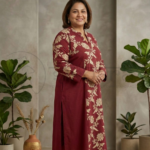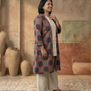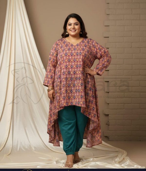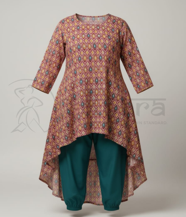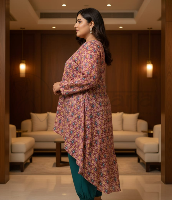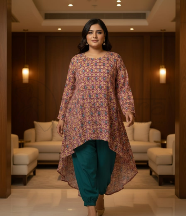 Step into effortless elegance with this beautifully designed asymmetrical kurta set. Crafted in a soft, breathable fabric, the kurta features an all-over geometric ikat-inspired print in rich, earthy tones that add warmth and sophistication to your look. The flattering V-neckline and three-quarter sleeves provide a balanced, graceful silhouette, while the high-low hemline with a flowing back panel adds movement and contemporary charm.