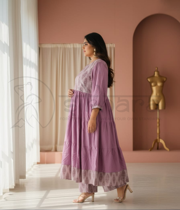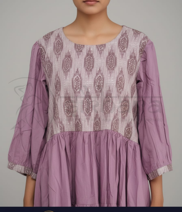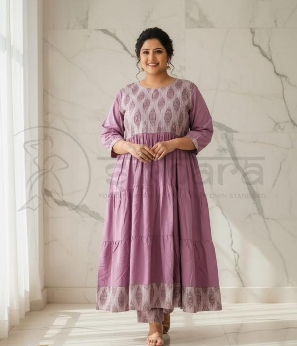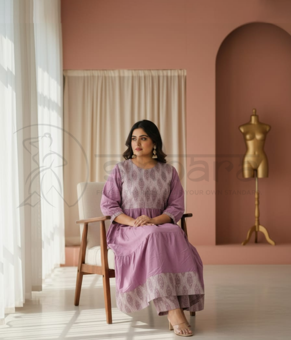Rendered in a muted mauve/lavender tone, this ensemble blends traditional charm with contemporary simplicity, making it ideal for casual festive occasions, office wear, and semi-formal daytime gatherings.